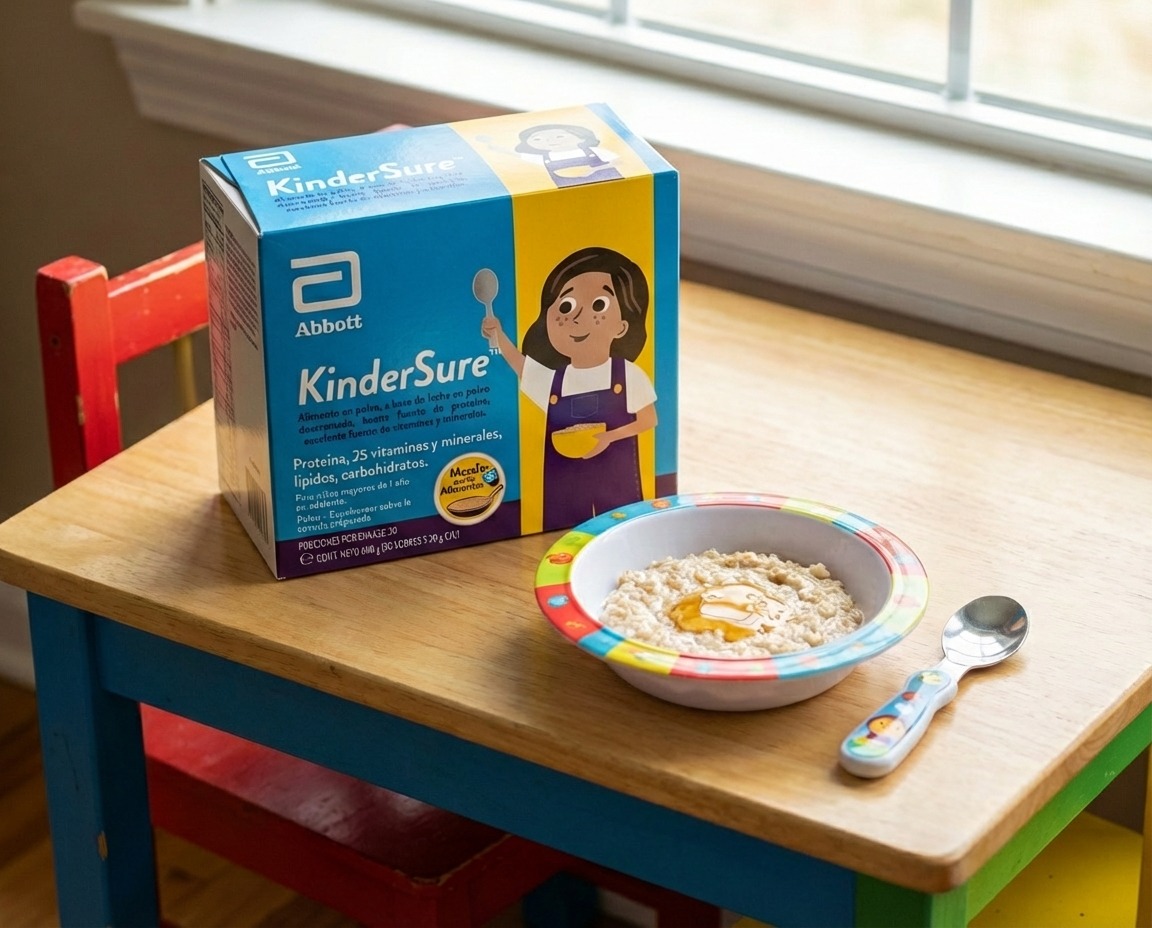 Abbott KinderSure es un complemento nutricional en polvo, diseñado para apoyar a niños y niñas en edad escolar que presentan retraso en el crecimiento o riesgo de padecerlo, contribuyendo al cumplimiento de sus necesidades nutricionales diarias.